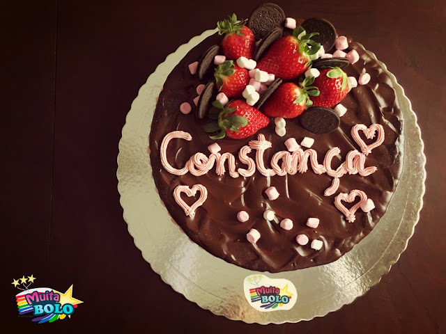 Cobertura: buttercream de baunilha, ganache de chocolate negro, morangos, bolachas Oreo e mini marshmallows.